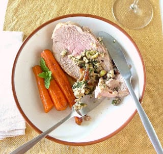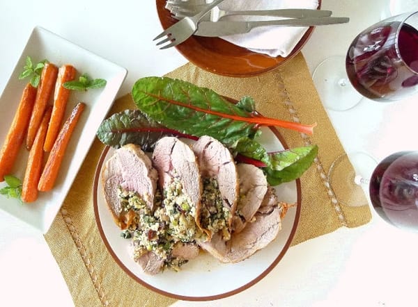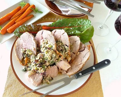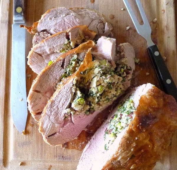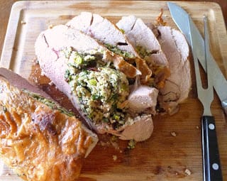 Remove lamb to a cutting board and allow it to rest for 20 minutes before cutting in thick slices. The stuffing will be loose and may need a spoon for serving.
