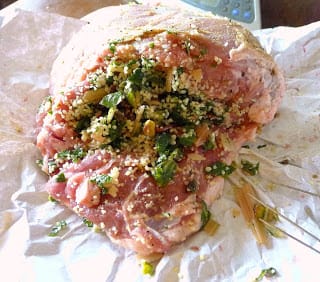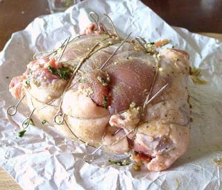 The meat has a deep pocket where the bone was pulled out. Another way to bone the leg is to butterfly it, by cutting it open, removing the bones and cutting horizontally through the thick sections to create a slab of meat that is more or less of equal thickness. The stuffing is spread on the meat and rolled up. Either way, the meat must be tied to keep the stuffing in and give the roast shape.