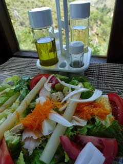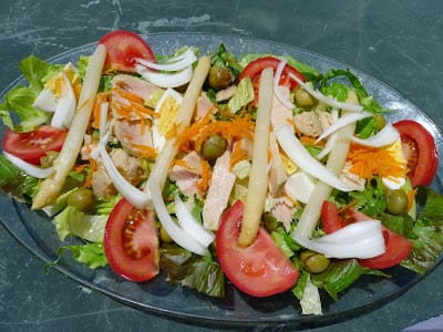 The Spanish ensalada mixta, or mixed salad, is a big production, served as a starter for a family meal. This is a “table salad,” served on a big platter and meant to be shared amongst the diners round the table. In traditional style, everybody eats from the serving dish, rather than dish out individual servings.