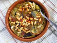 Divide the vegetable mixture between four to six cazuelitas (small earthenware ramekins). Cover the tops of each with beaten egg and sprinkle over the pine nuts. Sprinkle with pimentón.