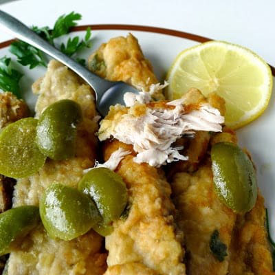 | Crispy on the outside, moist fish on the inside. Olives are a piquant sauce. |