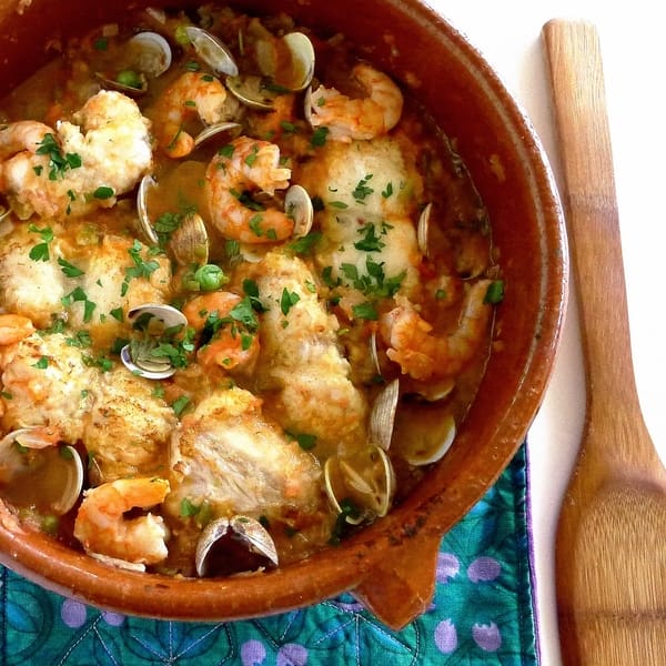 One of my favorite ways to cook monkfish is skewered and grilled as kebabs with a garlicky marinade. Another is cazuela de rape with an almond-saffron sauce. That recipe appears here in a blog about cooking in clay pot cazuelas (which, incidentally, is still my most-visited blog post). Another great recipe is suquet, a Catalan seafood stew (recipe here.)