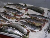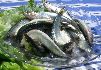 Sardines, plentiful both in the south (Mediterranean) and the north (Atlantic and Bay of Biscay), are of the blue fish family, related to herring. They are a greenish-blue touched with gold, with a silvery belly. Sardines never get much bigger than 8 inches (20cm), though smaller ones are also appreciated. (La mujer y la sardina, cuanto mas chica, mas fina—Women and sardines, the smaller the better.)