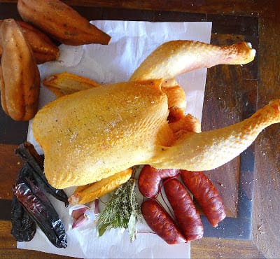Use chorizo link sausage, the slightly soft type that is best for grilling and stewing. (Dry-cured chorizo is best sliced as a cold-cut rather than used in cooking.) If chorizo is not available, use a spoonful of pimentón (paprika) mixed with olive oil for basting the chicken.