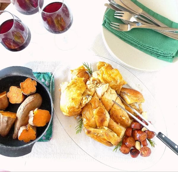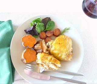 | Dinner from the oven - roast chicken with chorizo and sweet potatoes. Pour some red Rioja wine to go with it. |