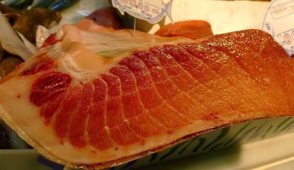 | Tuna belly with thick rim of fat. |
