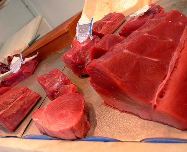 | Different cuts of tuna at Barbate market. |