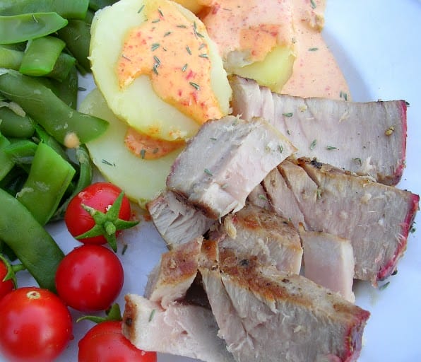 Back in my own kitchen, I am grilling a thick slab of tuna “loin.” The leftovers make fabulous summer salads.