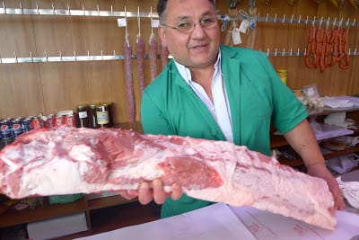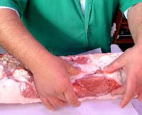 | Miguel Merino shows us a loin of Ibérico pork. |