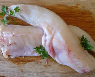 | Two fillets of monkfish (not all of it is needed for the soup). The enormous monkfish head was used to make fish stock. |