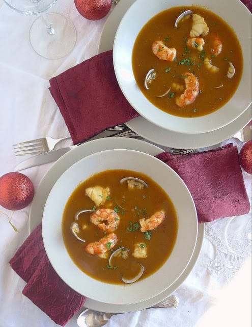 ‘Tis the season for one of my favorite soups, a lavish seafood extravaganza with fish and a couple kinds of shellfish. It’s perfect as a main course for family meals and for casual entertaining - maybe a tree-trimming party?—as well as an elegant starter for the cena de Noche Buena, the Christmas Eve dinner when it’s traditional to serve both fish and shellfish (as well as meat).