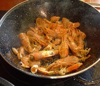 | Building flavour - shrimp heads and shells flavor the olive oil to cook the sofrito. |