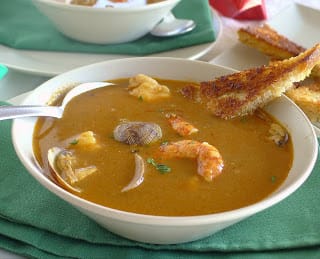| Typically, the seafood soup is served with strips of bread fried in olive oil. |