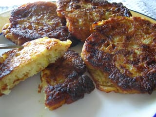Place oil to a depth of ¼ inch in a heavy skillet and heat on medium fire. Add spoonfuls of the batter to the pan. Smooth them lightly to make discs and allow to cook until golden on the bottom. Turn the pancakes and brown them on the reverse side. Remove and drain on absorbent paper. Continue frying the pancakes, adding more oil to the skillet as needed. Serve hot.