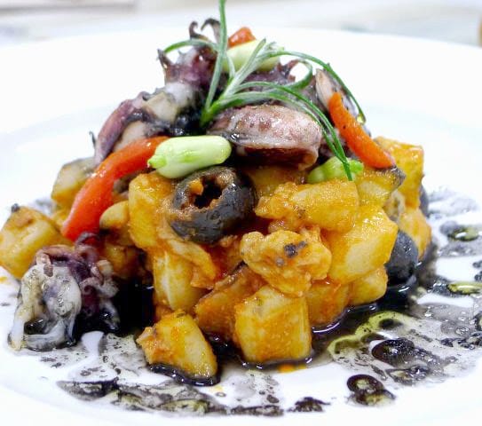 | Cuttlefish and potatoes with a sauce made with black cuttlefish ink. |