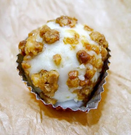 | Unwrapped, the kisses are rosemary-scented goat cheese "creams" with a crackly sweet almond topping. |