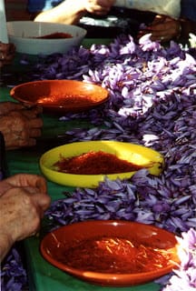 Traditionally, saffron production was a small, family enterprise, with each family planting no more than what its members could pick and process in a day—early morning in the fields, afternoon at the mondeo, the night tending the braziers for the drying operation.