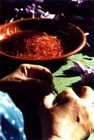 Crates filled with saffron crocuses are delivered to the mondaderas, the women who extract the three threads of the stigma from each crocus. The stigmas must be removed the same day that the flowers are picked or the flowers become pulpy and the precious stigmas are lost.
