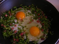 Here’s how. Cut away the root ends and chop the stems. (Twelve ounces of tagarninas will make about 2 ½ cups chopped greens, serving two.) Blanch them in boiling, salted water for 5 minutes. Drain well. Heat 2 tablespoons of olive oil in a skillet. Add 2 cloves sliced garlic, ¼ cup chopped serrano ham, a pinch of red pepper flakes and the greens. Sauté on medium heat for 4 minutes.