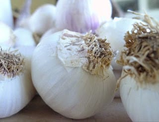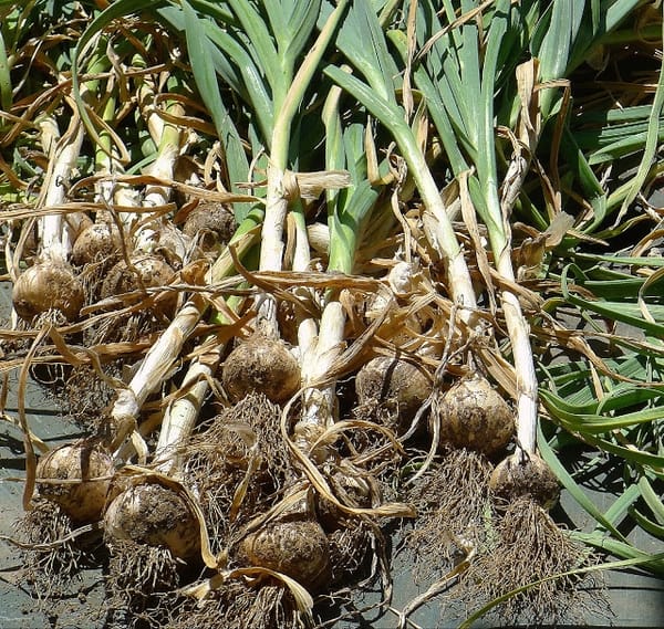 | A heap of freshly harvested garlic. After it dries in the sun a few days, I trim the roots and stems and store the bulbs for use. |