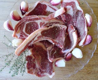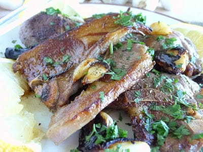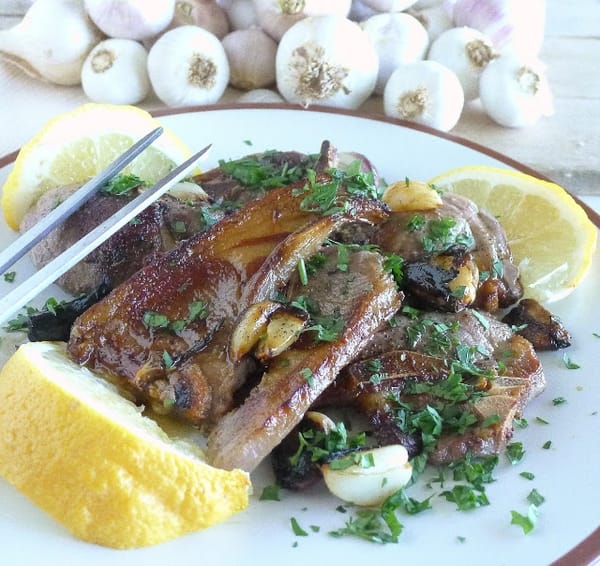 | Lamb chops browned in olive oil with whole cloves of garlic are finished with lemon juice. |