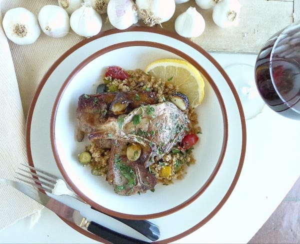 | Lamb chops and garlic are plated on a bed of quinoa with vegetables. Rice or cous cous or, Spanish style, fries, are good alternatives. Perhaps a La Mancha tempranillo to accompany the dish. |
